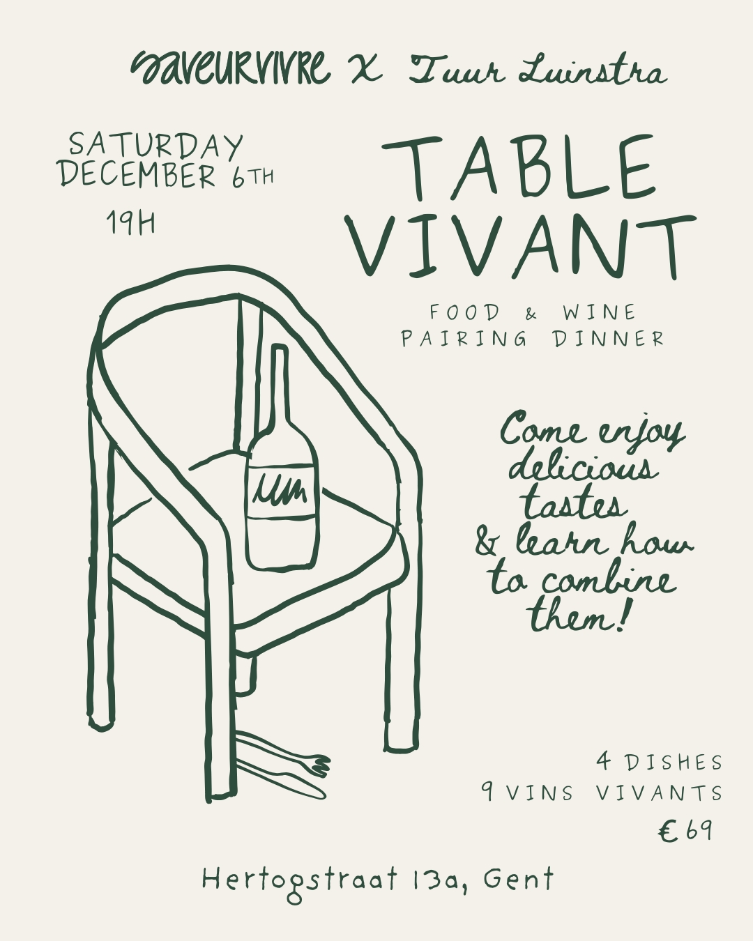 Saveur Vivre en chef Tuur Luinstra bundelen de krachten en nodigen je uit voor een avondje tafelen in gezellige huiskamersetting. Via een viergangenmenu en 9 wijnen kom je zelf ontdekken hoe de smaken in je glas het lekkers op je bord kunnen versterken en omgekeerd.
